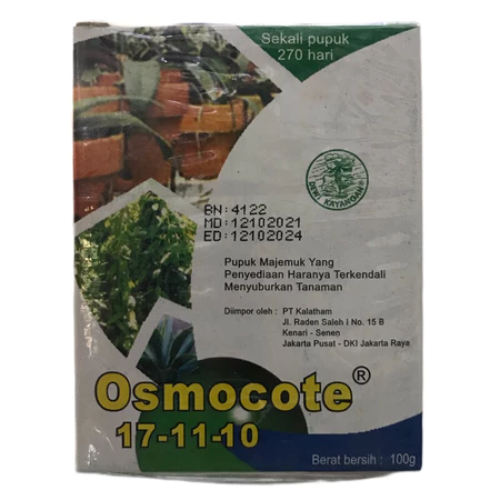 Osmocote 17-11-10: Pupuk ini memiliki kandungan Nitrogen (N) Total = 17,0%, Fosfat (P2O5) tersedia = 11,0%, dan Kalium (K2O) larut air = 10,0%. Cocok untuk berbagai tanaman, termasuk tanaman buah, sayuran, dan hias.