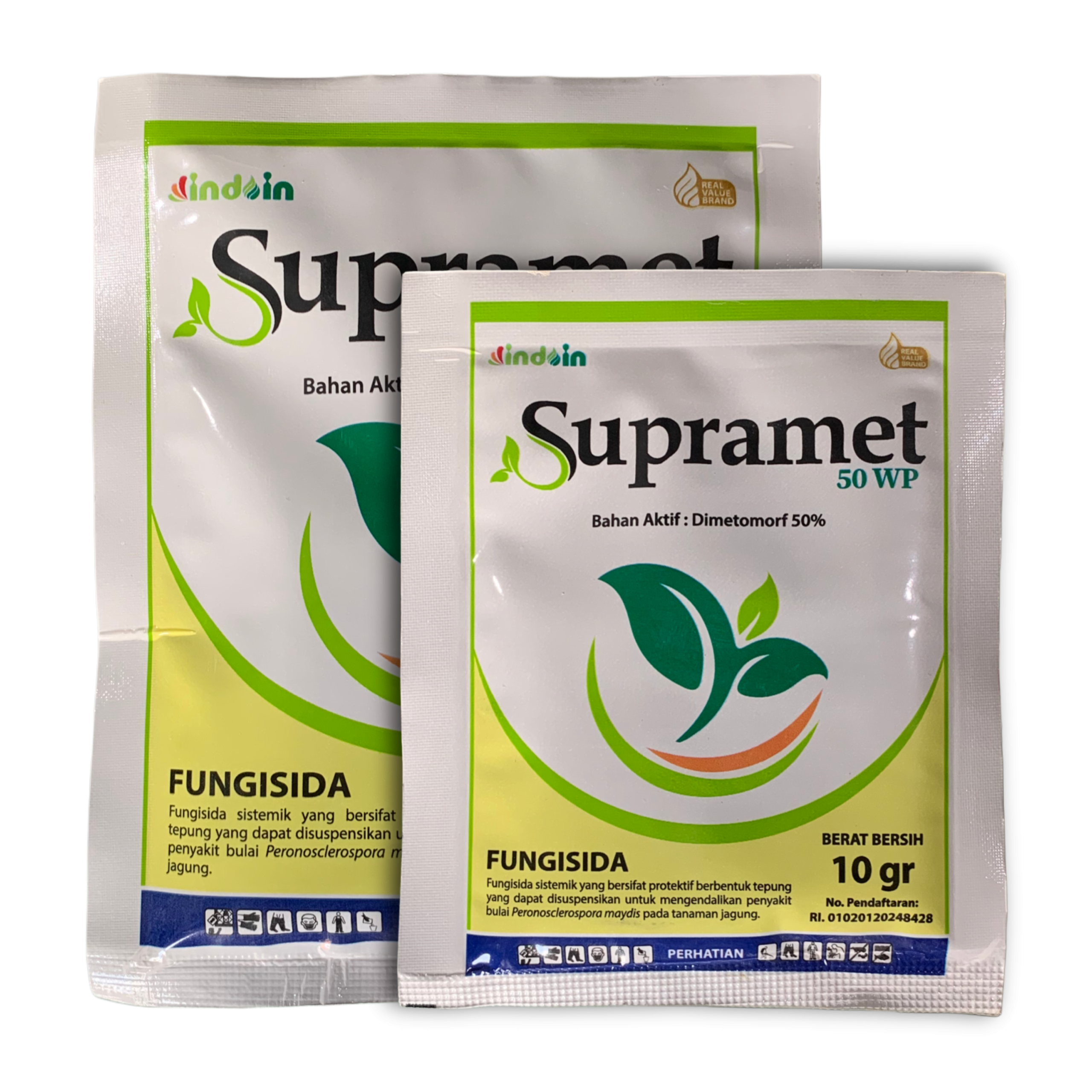 Supramet 50 WP adalah fungisida sistemik berbentuk tepung berwarna putih yang dapat didispersi dalam air. Produk ini bekerja secara protektif untuk melindungi tanaman dari serangan penyakit. Dengan kandungan bahan aktif Dimetomorf 50%, Supramet efektif digunakan untuk mengendalikan penyakit bulai (Peronosclerospora maydis) pada tanaman jagung.